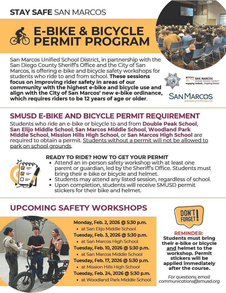 🚲 Stay Safe, San Marcos!E-Bike & Bicycle Permit Program + Safety WorkshopsStudents who ride an e-bike or bicycle to and from school are required to have an SMUSD permit. This applies to student...