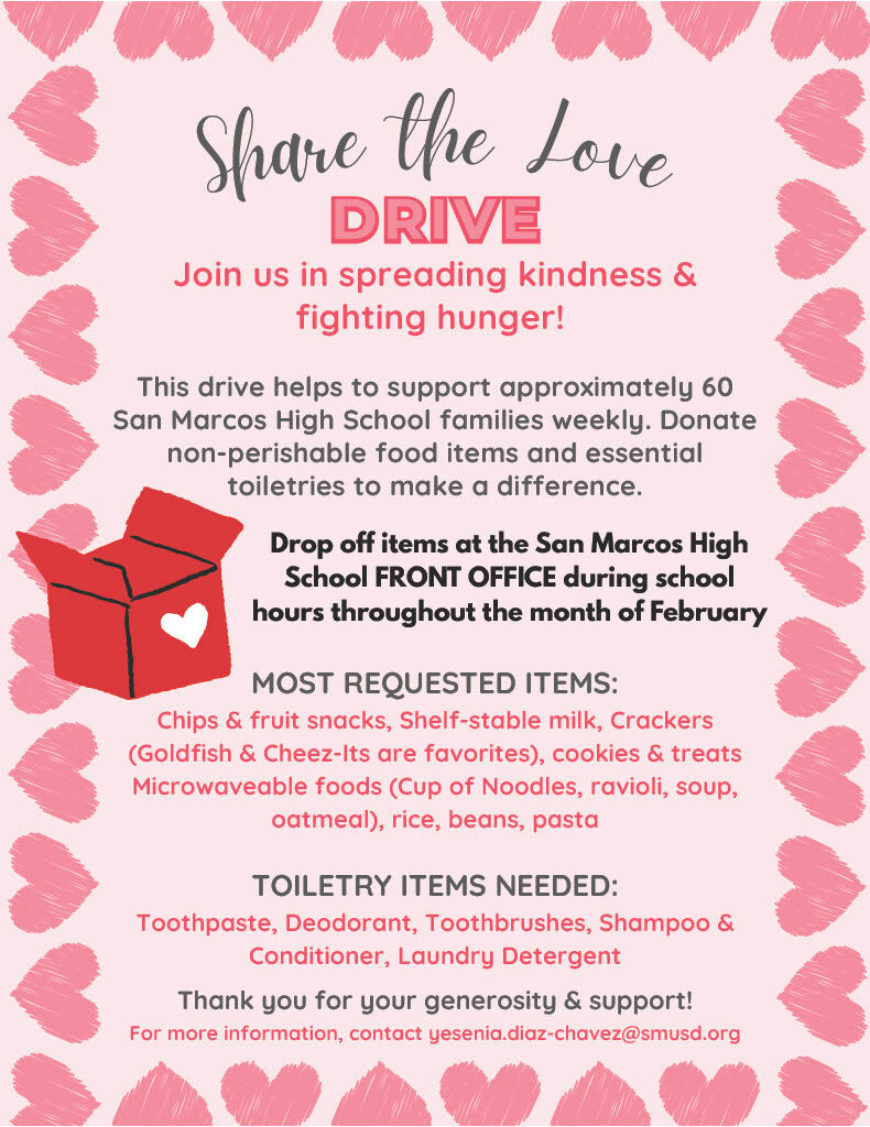 This February, San Marcos High School is coming together to support families in need through our Share the Love Drive. With your help, we can make a meaningful difference for approximately 60 SMHS ...