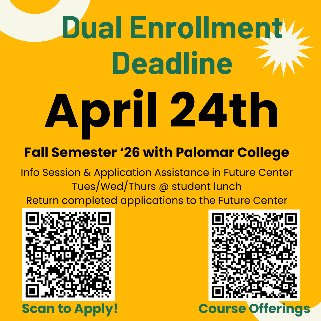 Don’t miss your chance to get ahead for Fall Semester ’26 with Palomar College!📅 Deadline: April 24thNeed help applying? We’ve got you covered!📍 Stop by the Future Center during lunch on: Tuesday W...
